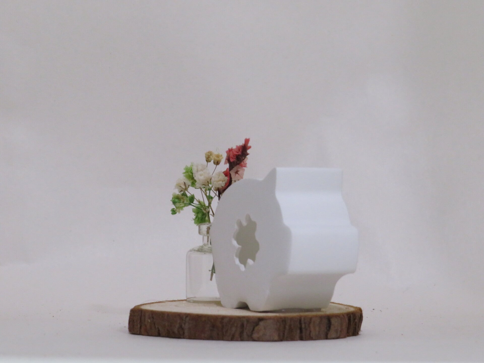 Ein fertig dekroriertes Schweinchen oder ein Engel auf einer Baumscheibe mit ein paar Trockenblumen in einer Glas vase. Artikelnr.00162